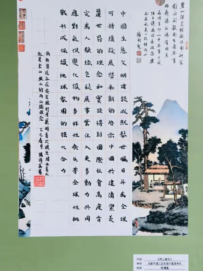 在“蜀风雅诵 天府丹青”第三届成都市青少年书画传习大会中,刘思言、杨清菡等2位同学的作品入展温江区作品展,其中杨清菡同学晋级市决赛。