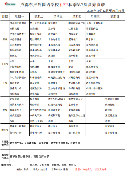 成都东辰外国语学校高三秋季第 6周营养食谱