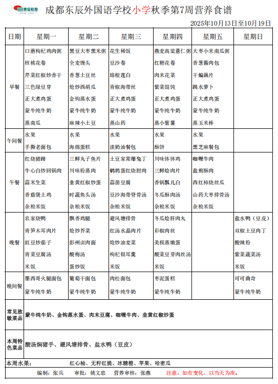 成都东辰外国语学校小学秋季第7周营养食谱