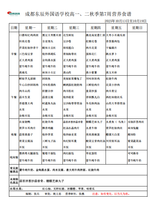 成都东辰外国语学校高一、二秋季第7周营养食谱
