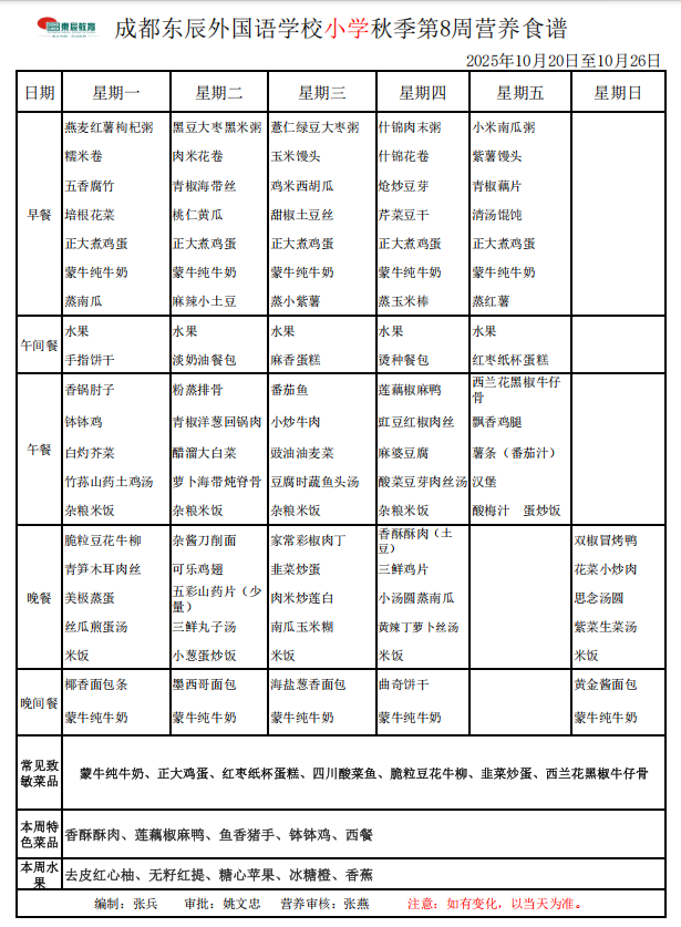 成都东辰外国语学校小学秋季第8周营养食谱