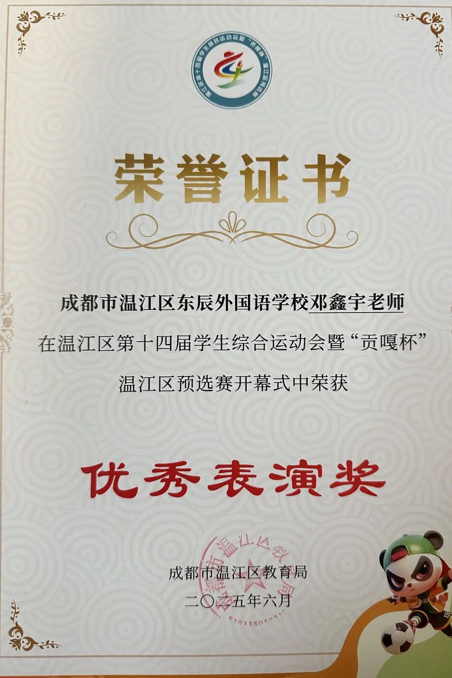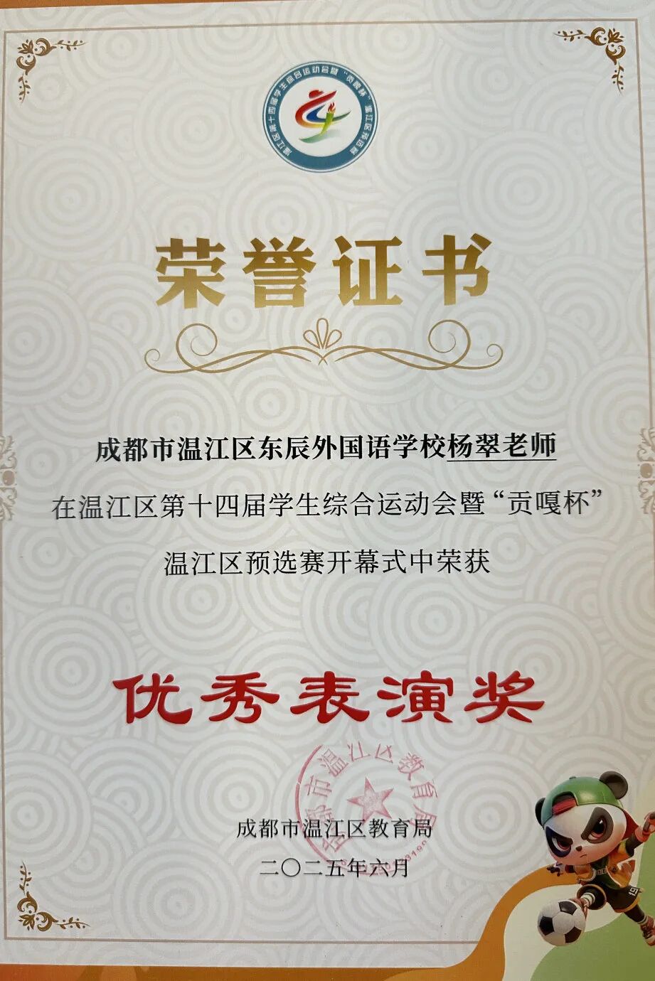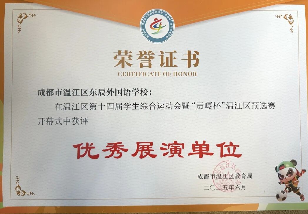 在温江区第十四届学生综合运动会暨“贡杯”温江区预选赛开幕式中,杨翠、张瑾、邓鑫宇等老师荣获“优秀表演奖”,学校获评“优秀展演单位”。