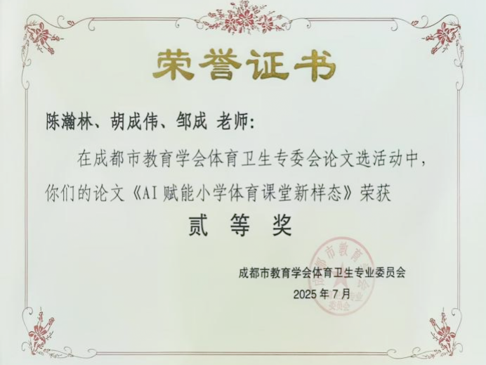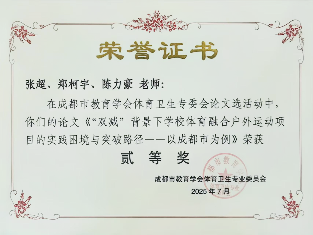 在成都市教育学会体育卫生专委会论文遴选活动中,我校多位老师斩获佳绩。丁东兴等老师的论文《中小学生对足球运动有兴趣的多因素模型回归研究》获“第三届四川省体育科学大会专题报告”一等奖。