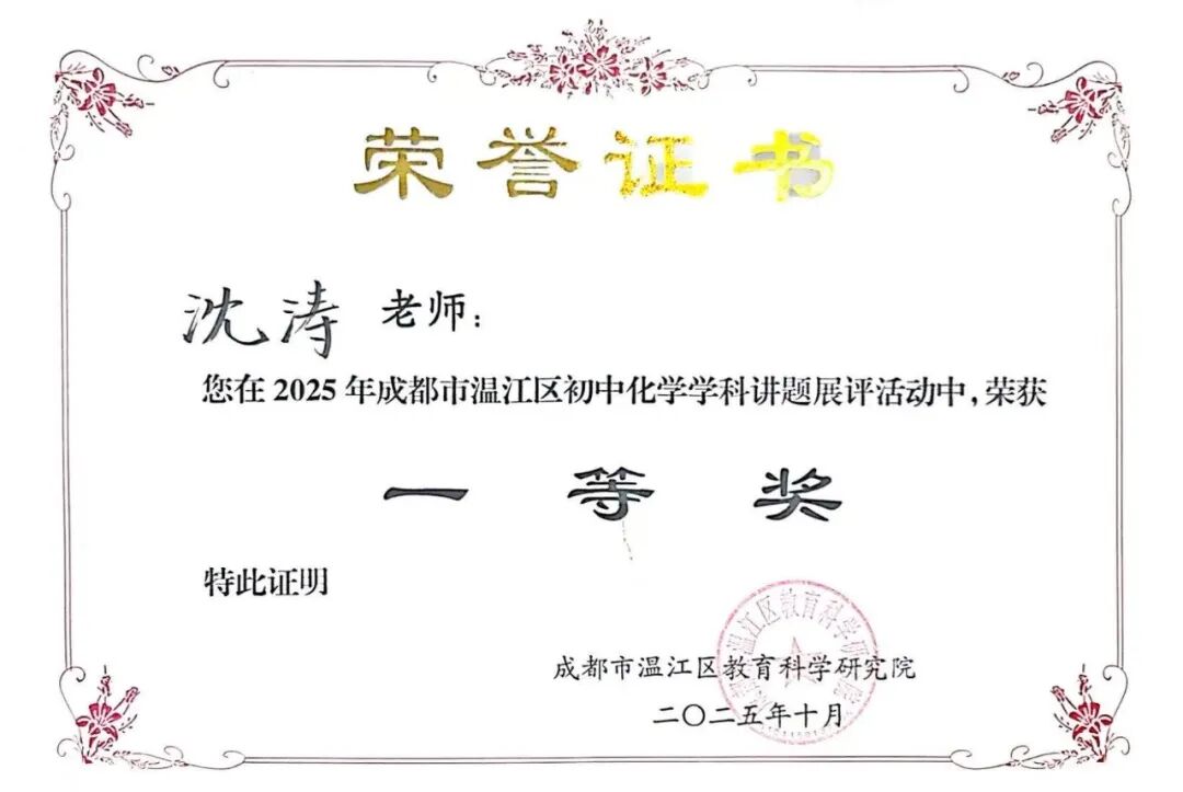 化学组沈涛老师参加2025年温江区高质量课堂研讨活动——青年教师讲题比赛获一等奖。