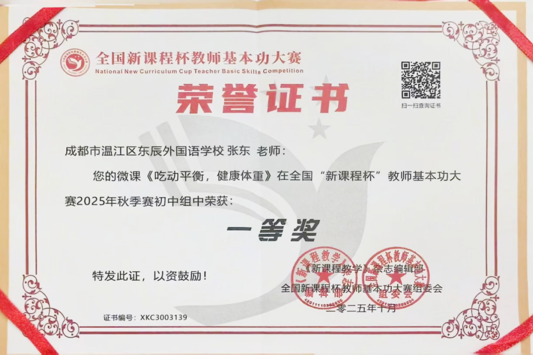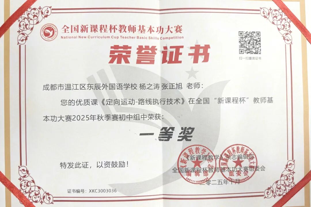 在全国“新课程杯”教师基本功大赛2025年秋季赛中,周鑫老师的说课作品《<定向运动>——路线规划》,获小学组一等奖;张东老师的微课作品《吃动平衡,健康体重》和杨之涛、张正旭老师的优质课作品《定向运动——路线执行技术》,均获初中组一等奖。