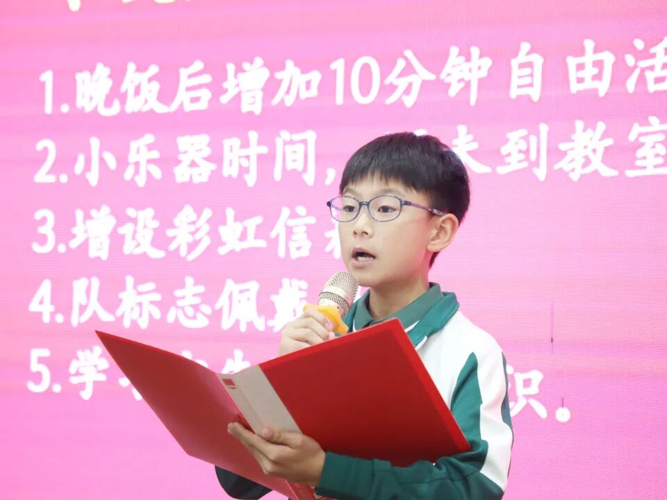 大会严格遵循少先队会议规程开展,共收到21份有效提案,内容涵盖学校建设、教育教学、后勤服务、德育等多个方面。在提案答复环节,大队长周懋涵同学代表大队委首先汇报调研情况,随后各部门负责人针对各类提案进行了细致解答。最后,大会在激昂的呼号声中圆满闭幕,充分展现了我校少先队员参与校园民主管理的积极性和责任感。