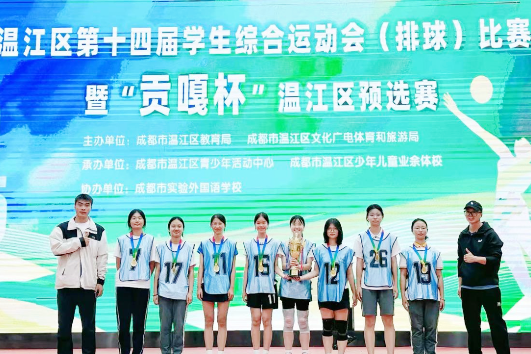 在温江区第十四届学生综合运动会(排球)比赛暨“贡嘎杯”温江区预选赛中,我校小学、初中女子排球队获冠军,高中女子排球队获亚军。邓鑫宇、邓玉龙、周苏华等老师获评“优秀教练员”。