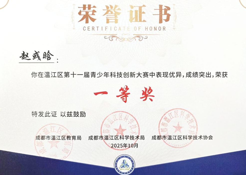 近日,在温江区第十一届青少年科技创新大赛中,赵彧晗同学获科学论文一等奖,王玉国老师获评“优秀指导教师”。同时,我校荣获“优秀组织单位”称号。