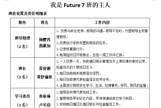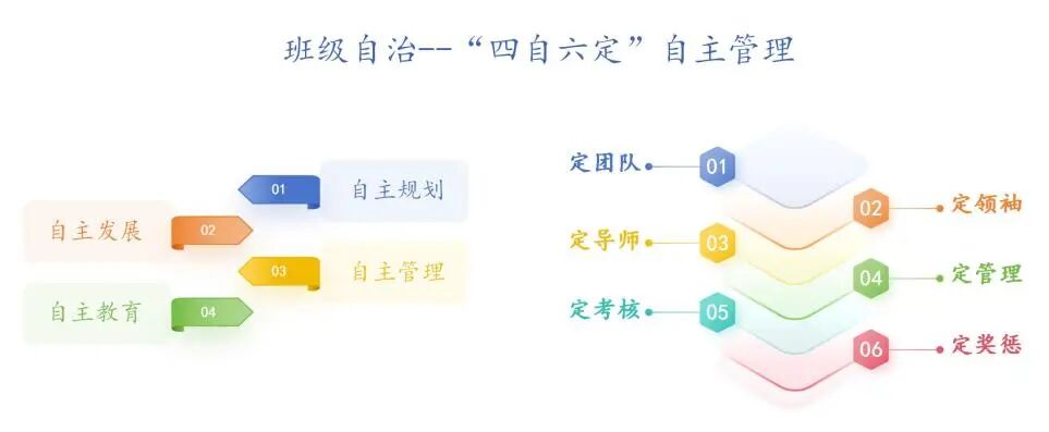 落实 “四自六定”(自我管理、自我教育、自我服务、自我监督;定目标、定计划、定制度、定责任、定评价、定改进),由班级委员会牵头组织班会、班级活动、常规检查。