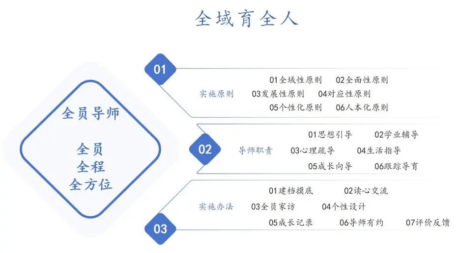 紧扣 “立德树人” 根本任务,构建“全员、全程、全方位”育人格局,以 “理解、帮助、激励” 为核心实施策略。