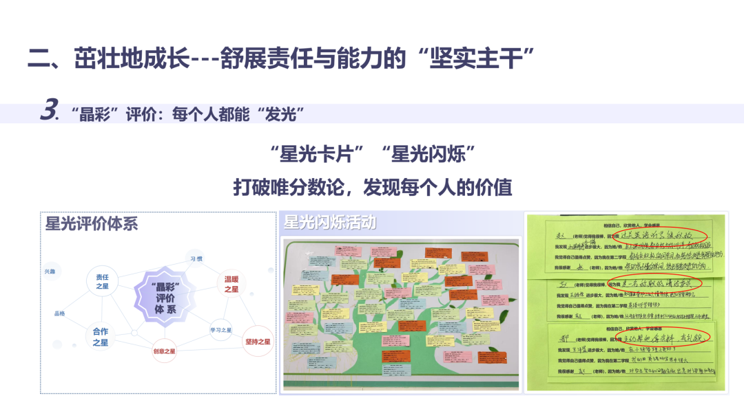 构建“天天评比(行为规范星)+ 周周表彰(优秀个人 / 小组)+ 月月激励(成长之星)+ 学期展示(明星班级 / 寝室)” 的星级评价体系,以 “激励” 点燃学生成长动力,实现学业进步与综合素质提升的有机统一。