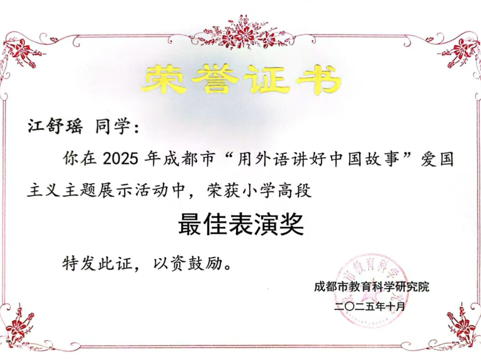 在2025年成都市“用外语讲好中国故事”爱国主义主题展示活动中,江舒瑶同学荣获小学高段“特等奖”和“最佳表演奖”。陈文老师获评“优秀指导教师”。