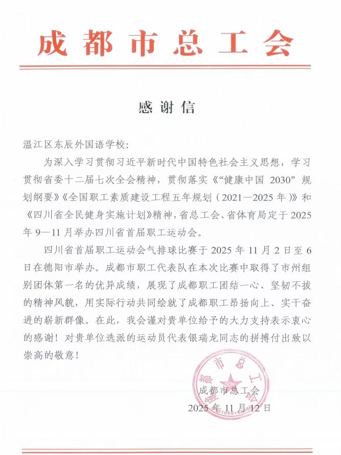 近日,成都市总工会致信我校,感谢我校教师银瑞龙在四川省首届职工运动会中的突出贡献。银瑞龙老师代表成都职工队参加四川省首届职工运动会排球赛,凭借出色表现助力团队荣获市州组别团体第一名。