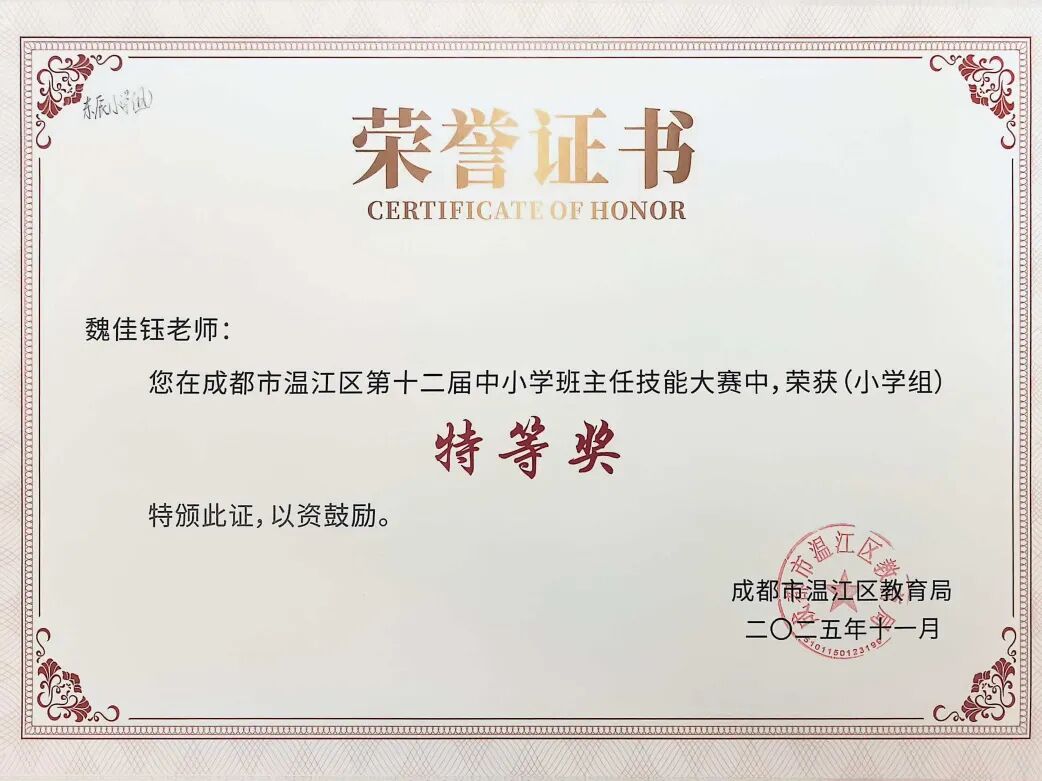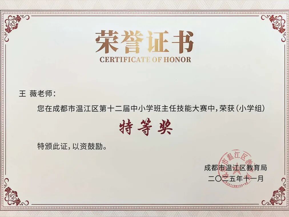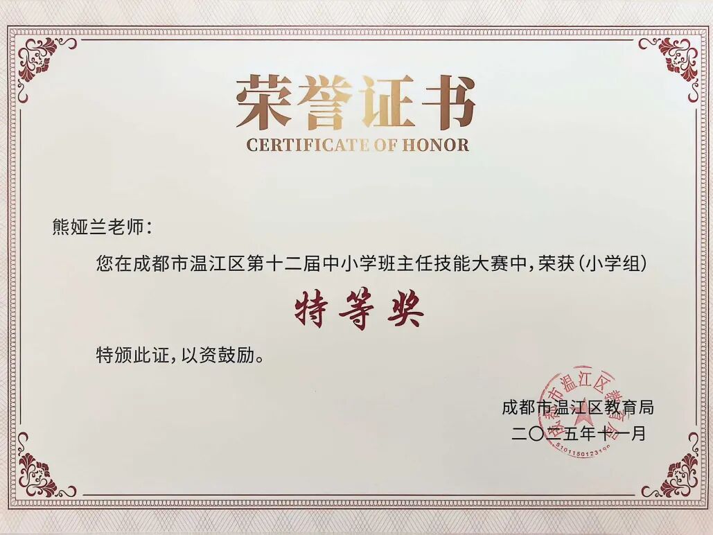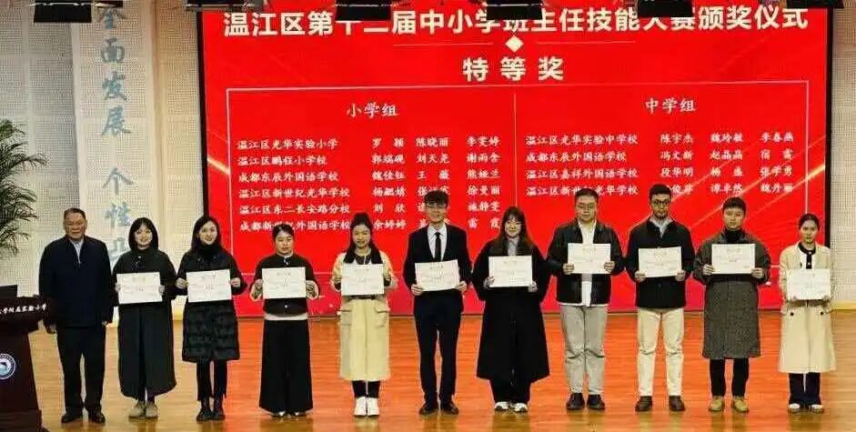 在温江区第五届班主任素养展评暨温江区第十二届中小学班主任技能大赛中,熊娅兰、魏佳钰、王薇三位老师获“特等奖”。