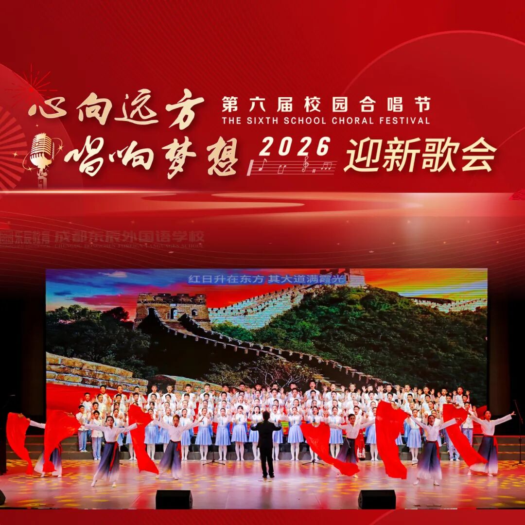 为深入贯彻落实新时代学校美育工作要求,深化爱国主义教育,提升学生艺术素养,营造朝气蓬勃、向善向美的校园文化氛围,2025年12月30日,成都东辰外国语学校“心向远方,唱响梦想”第六届校园合唱节总决赛暨2026年迎新歌会在文汇大礼堂华彩绽放。