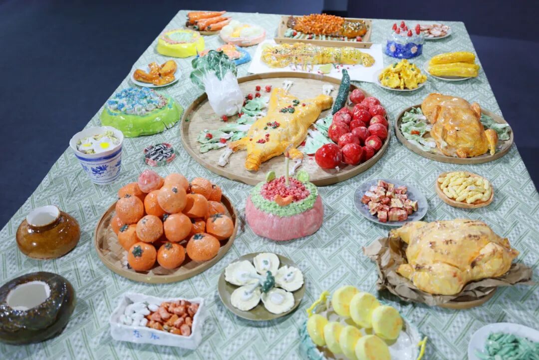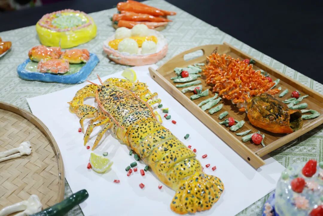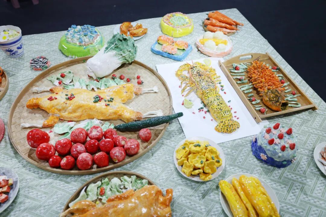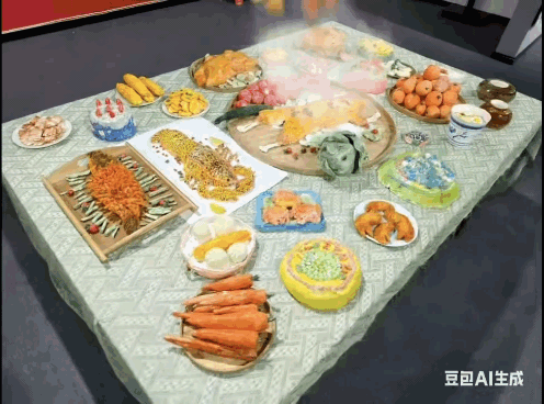 以食育课程为主题的陶艺作品,AI把坚硬、静态的烧鸡、烤鸭、蛋糕等陶艺佳肴叠加流动热气、柔光渐变特效,让“盘中餐”仿佛刚出锅般冒着氤氲暖意,趣味十足。