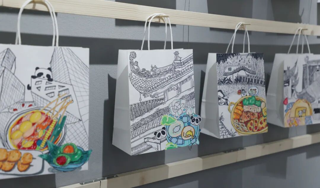 六年级“川韵童绘”提袋计划以四川老房、美食为主题,融合AI与手工创作。项目始于一年级,教师通过剪贴修补稚嫩画作,提升孩子信心;至六年级,学生已能独立完成完整作品。手提袋从承载片段到展现六年成长,成为移动的展馆,见证每个孩子“从不敢画到自信创作”的蜕变。