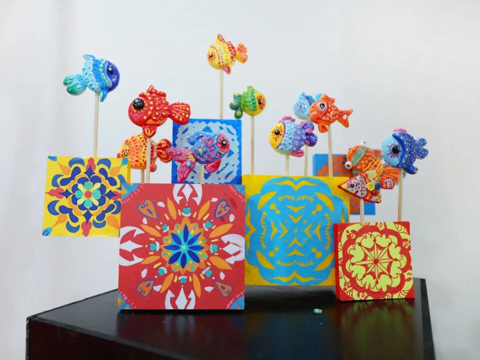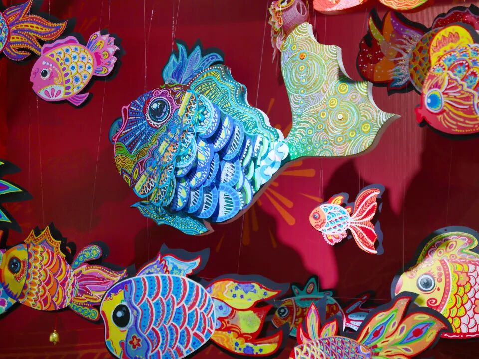 三年级《年年有鱼》作品创作中,学生输入“鱼灯纹样”“箔画肌理”“非遗配色”等关键词,AI生成多组创意草图明确创作方向,并手工完成鱼灯糊制与烧箔绘制。