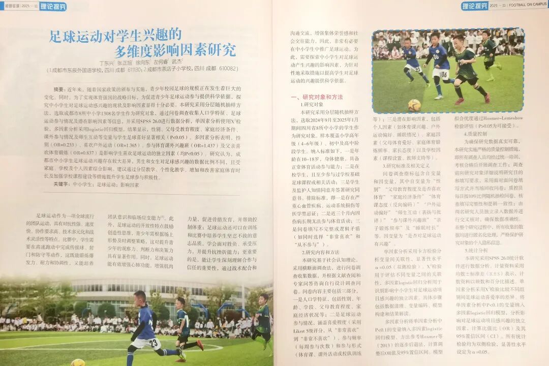丁东兴、张正旭、徐向东、左何睿老师合作撰写的论文《足球运动对学生兴趣的多维度影响因素研究》已发表于《校园足球》杂志2025年第11期。该杂志是由教育部主管,全国青少年校园足球工作领导小组办公室、中国中学生体育协会、中国大学生体育协会、中国教育科学研究院主办的国家级期刊。