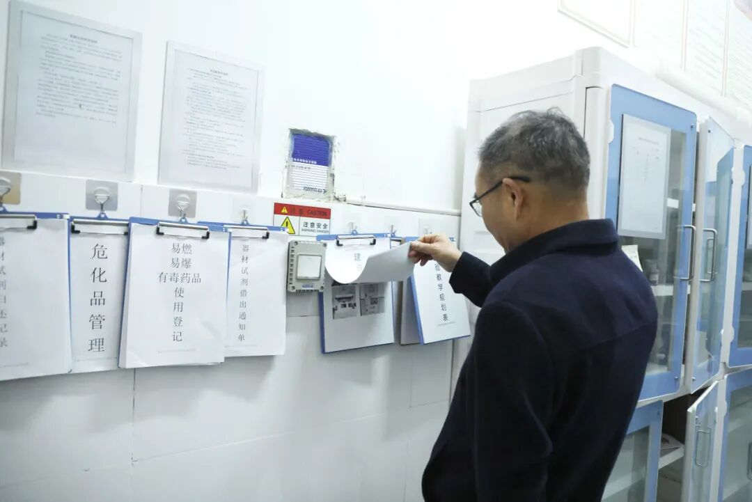 针对理化生实验室,检查组重点查看了危险化学用品的存放、领用登记台账及“双人双锁”管理制度落实情况,确保实验教学安全规范、危化品管理万无一失。